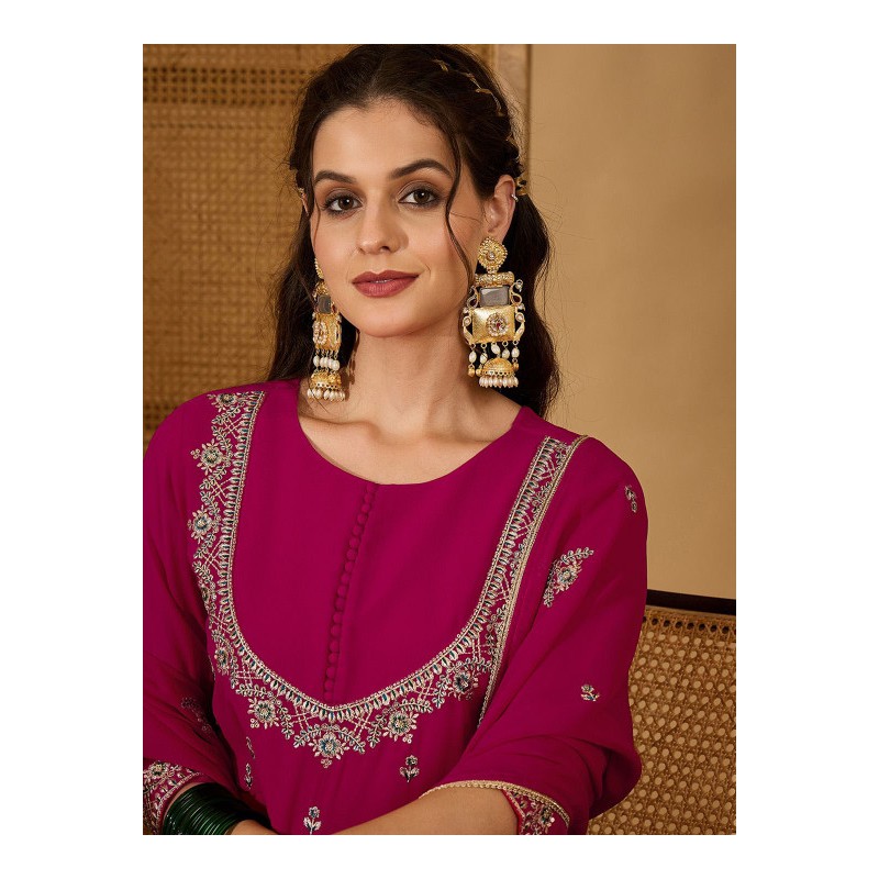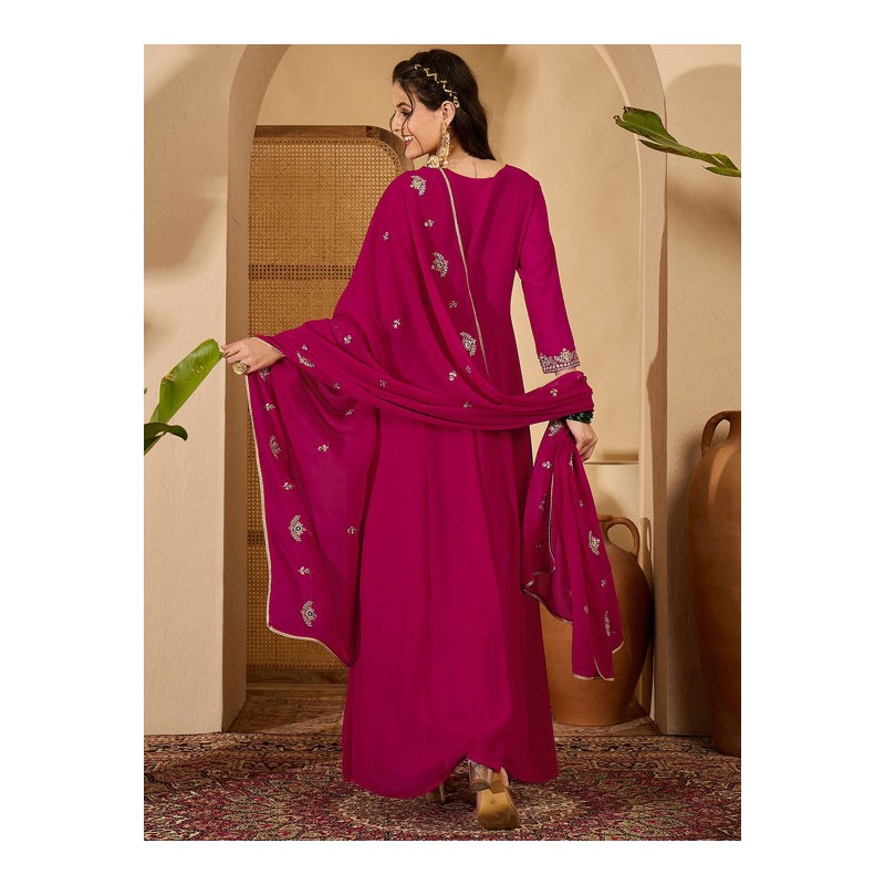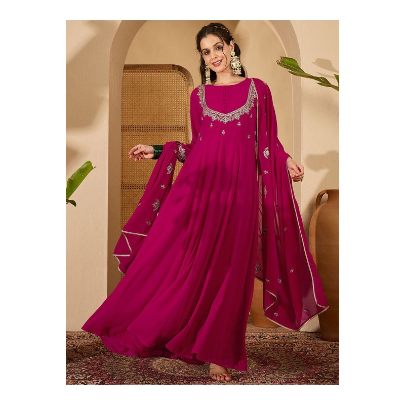 Длинное индийское платье ярко розового цвета с вышивкой золотой нитью и пайетками. Платье имеет А-силуэт, округлый вырез, рукава три четверти. У платья есть подкладка. В комплекте дупатта, расшитая золотой нитью, пайетками и тесьмой.