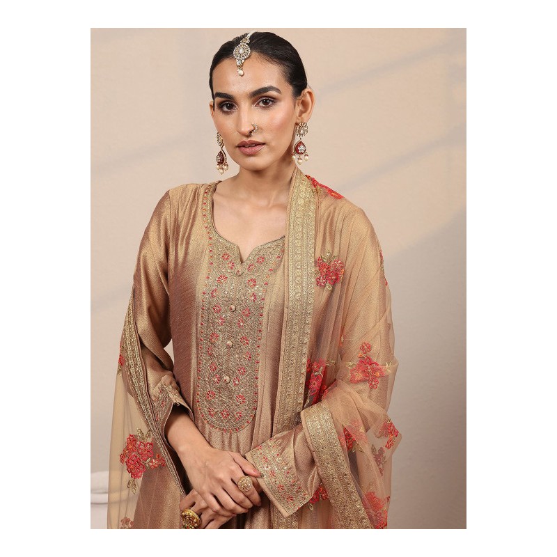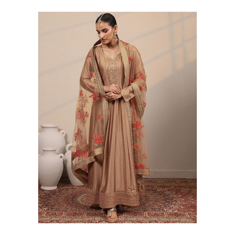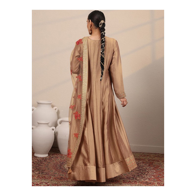 Длинное индийское платье золотисто бежевого цвета с вышивкой золотой нитью и пайетками. Платье имеет А-силуэт, округлый вырез, рукава три четверти, карманы по бокам. У платья есть подкладка. В комплекте дупатта, расшитая золотой нитью, пайетками и тесьмой.