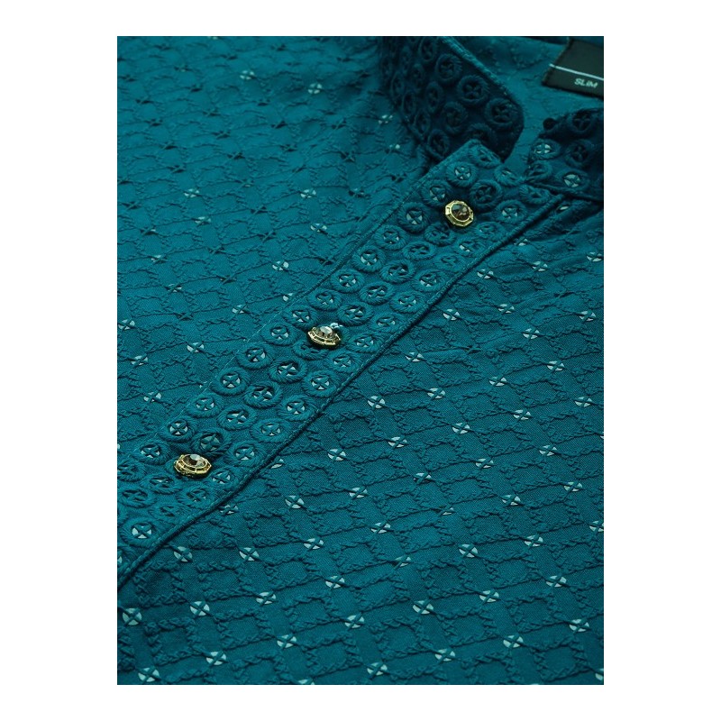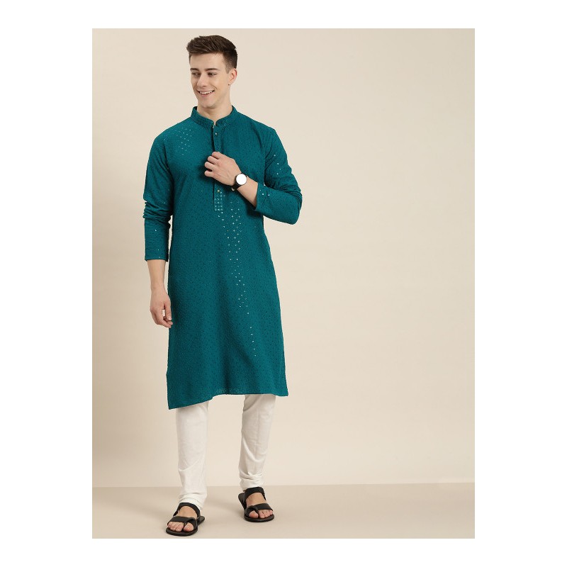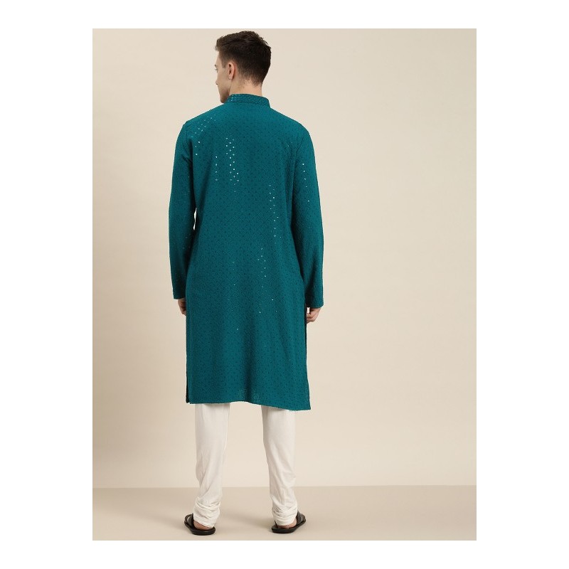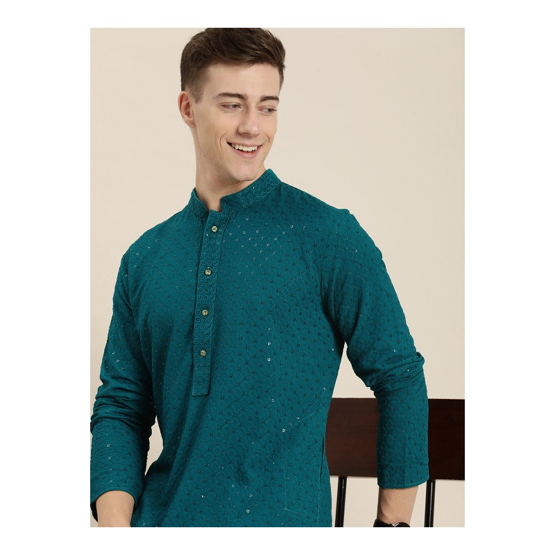 Индийская мужская длинная курта синего цвета с вышивкой пайетками и нитью. Имеет китайский воротничок, планку золотистых пуговиц, длинные рукава, карманы по бокам, разрезы по сторонам.