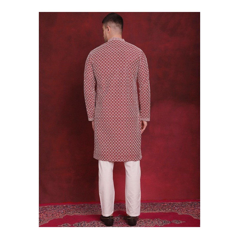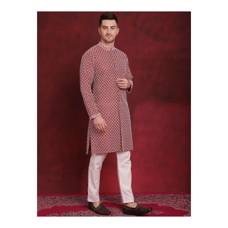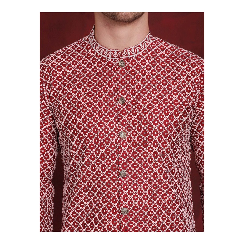 1) бордового цвета шервани (индийский пиджак) с вышивкой белой нитью и мелкими пайетками, с китайским воротничком, с длинными рукавами, по бокам разрезы, планка с медными пуговицами, расстегивается полностью;