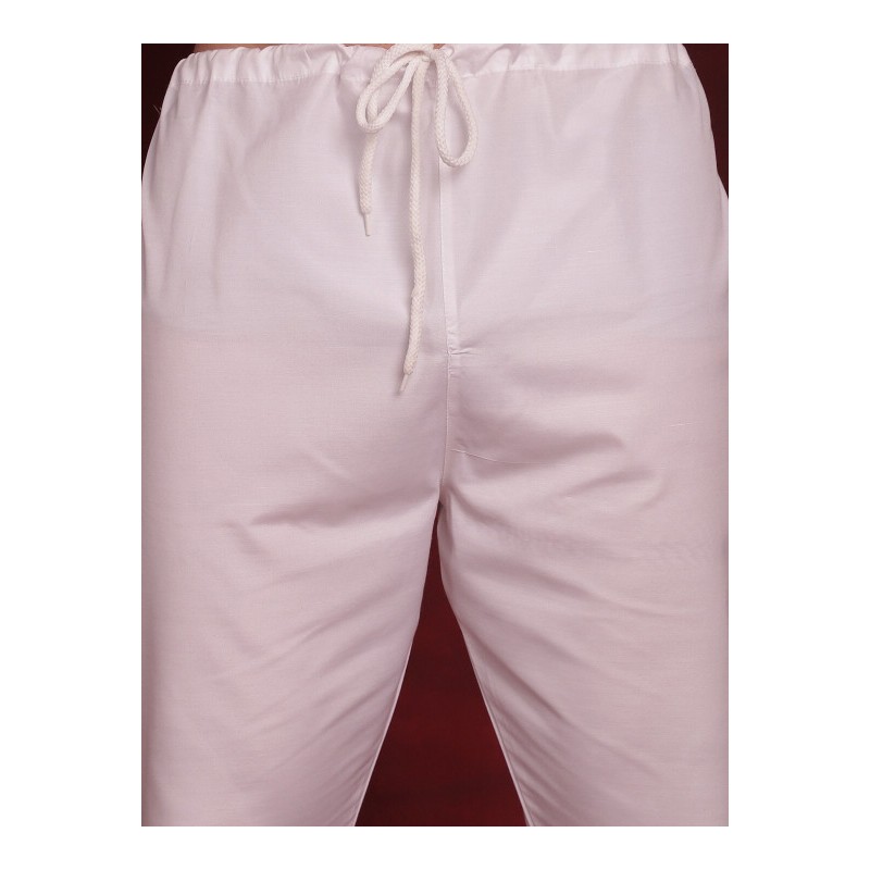 2) штаны белого цвета, на поясе штаны затягиваются шнурком.