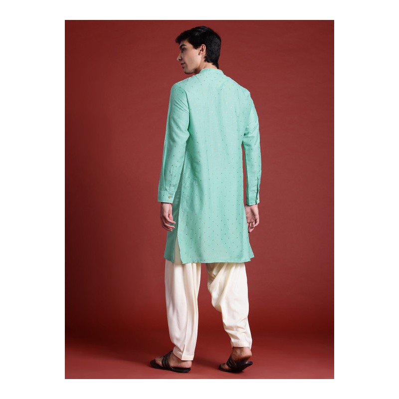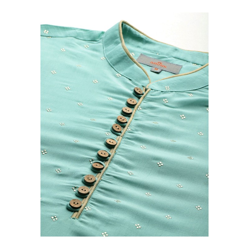 1) курта мятного цвета с золотыми узорами с китайским воротничком, с планкой с декоративными пуговицами, с длинными рукавами, по бокам разрезы, карманы с двух сторон;