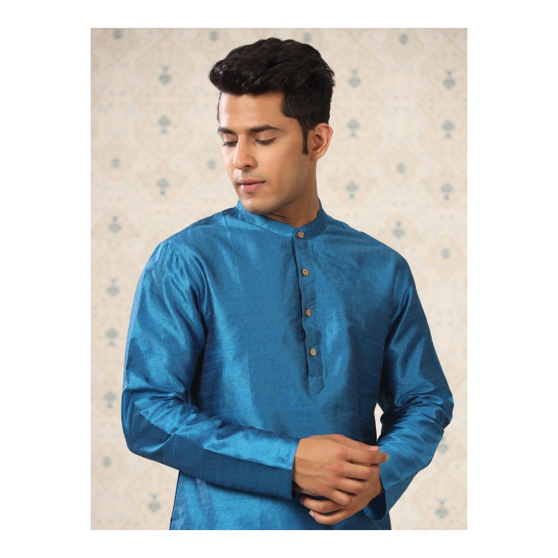 1) синего цвета курта с китайским воротничком, с длинными рукавами, по бокам разрезы, карманы с двух сторон, планка с пуговицами;