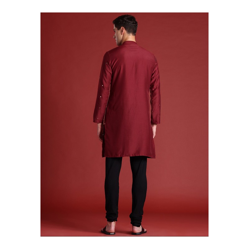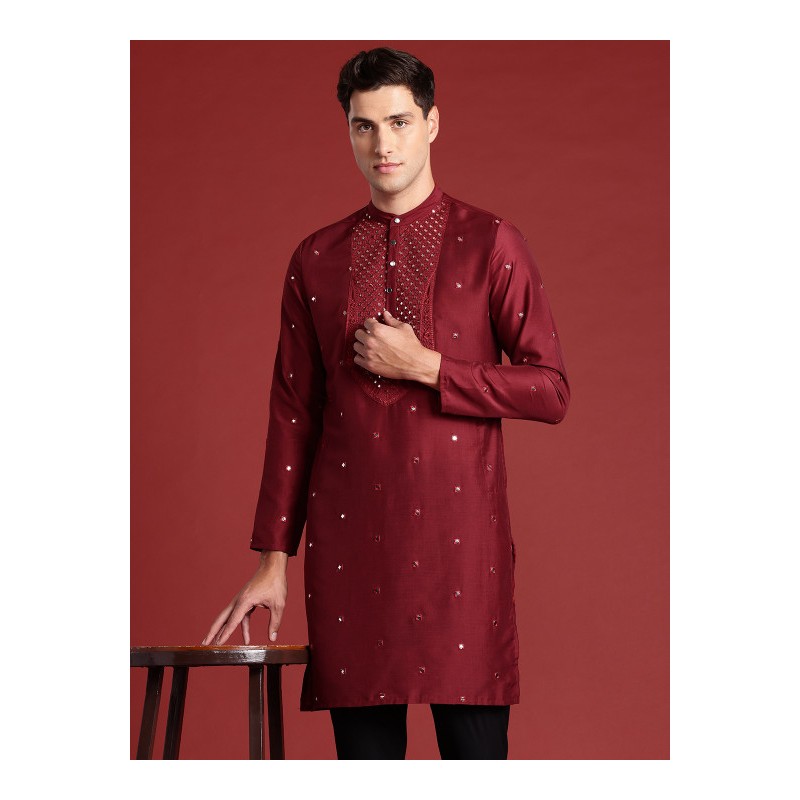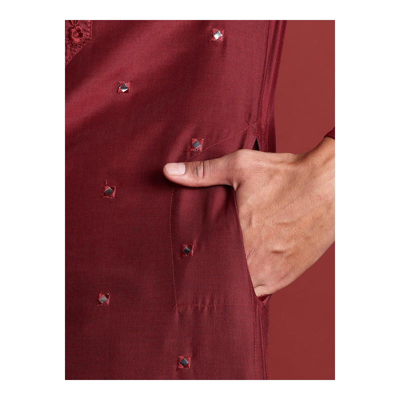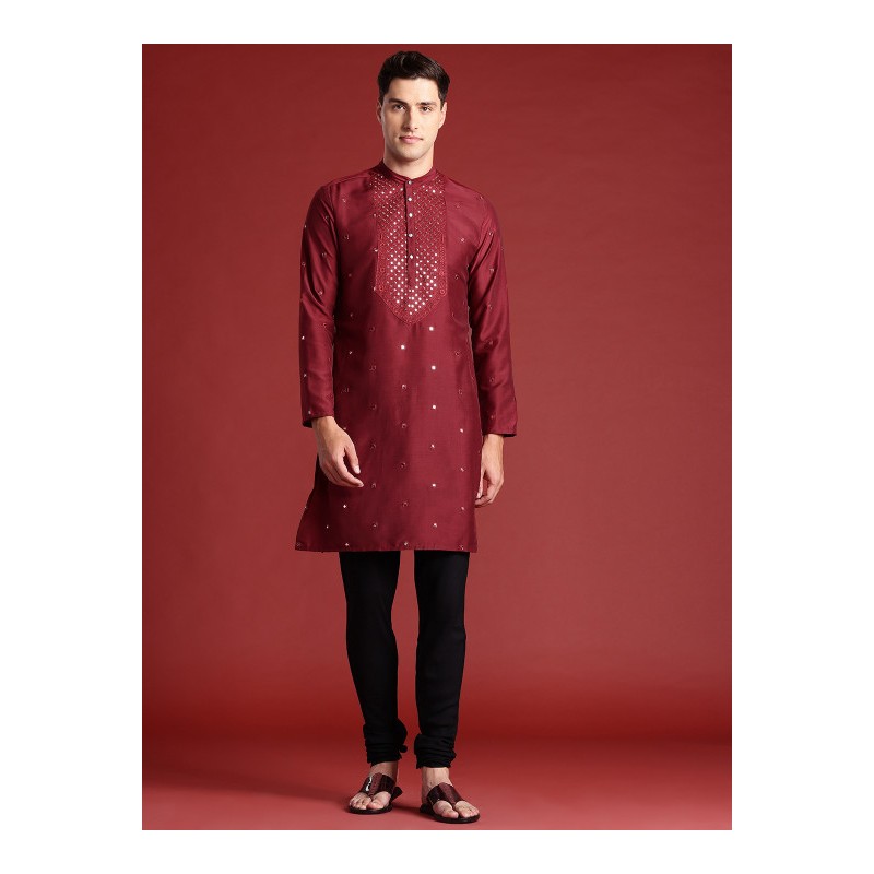 Индийская мужская курта бордового цвета с вышивкой (имитация раджастанских зеркалец). Имеет китайский воротничок, ряд декоративных пуговиц, длинные рукава, карманы по бокам, разрезы по сторонам. В комплекте длинные брюки чуридары, собираются гармошкой на щиколотках.