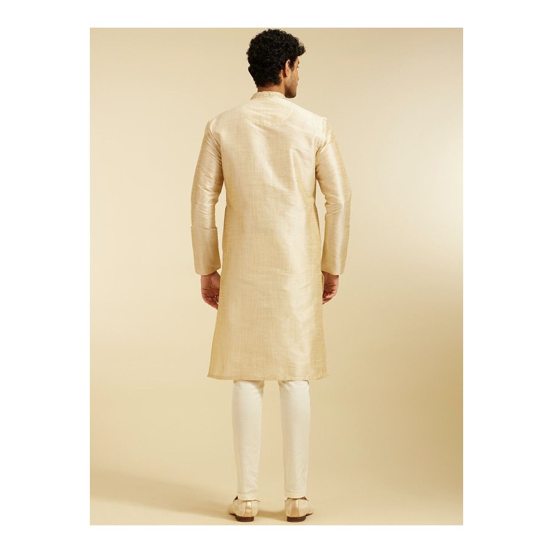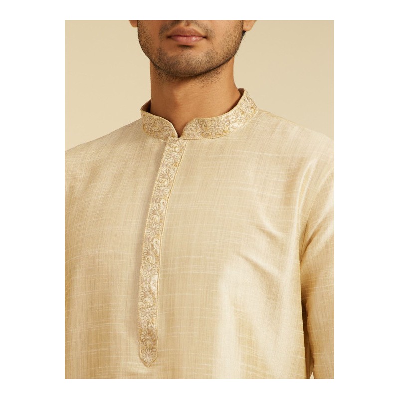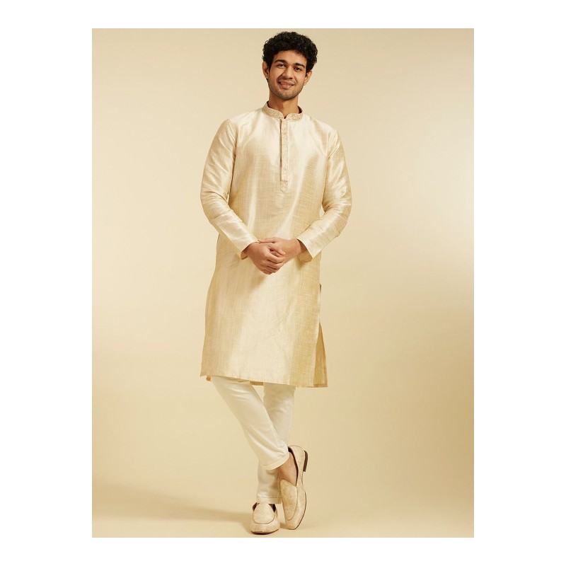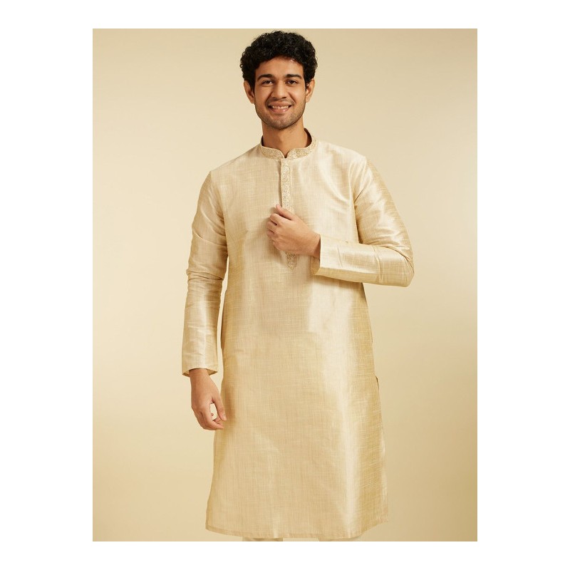 Индийская мужская длинная курта светло бежевого цвета. Имеет китайский воротничок с вышивкой со скрытой планкой пуговиц, длинные рукава, карманы по бокам, разрезы по сторонам.