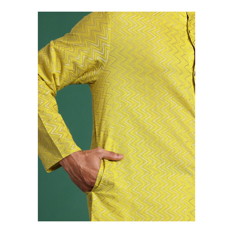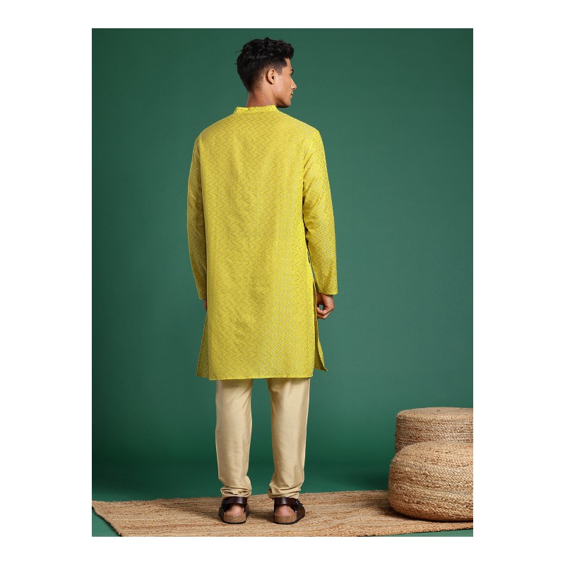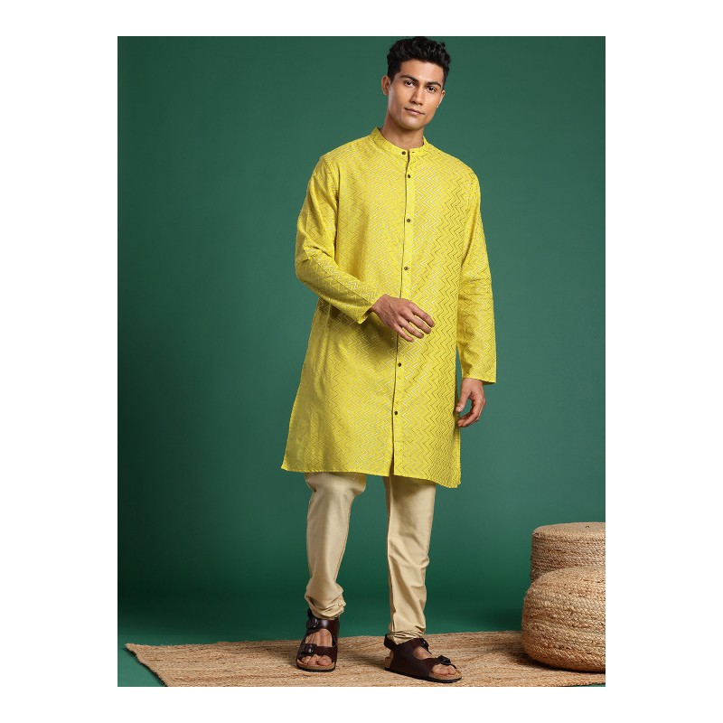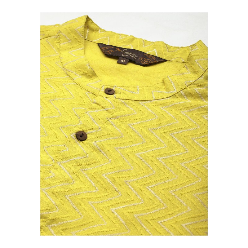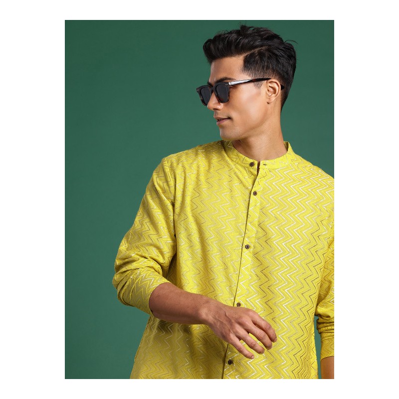 Индийская мужская длинная курта цвета лайма с узорами шеврон (плетение ткани). Имеет китайский воротничок, ряд декоративных пуговиц (расскрывается полностью), длинные рукава, карманы по бокам, разрезы по сторонам и спереди.