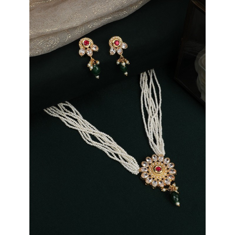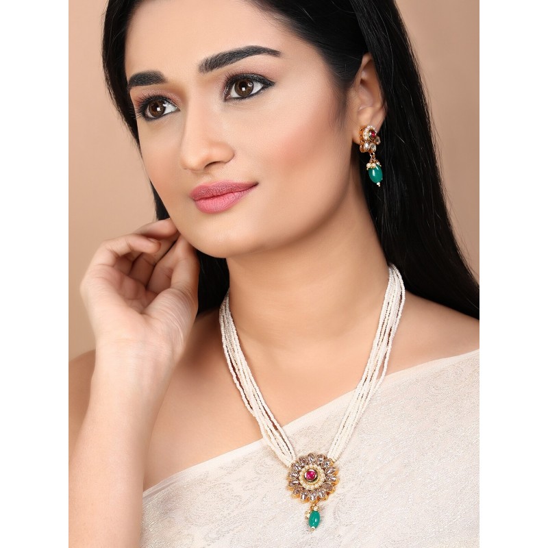 Металл - под золото. Камни белые, ярко розовые. Зеленые бусины. Искусственный жемчуг.
