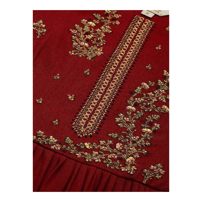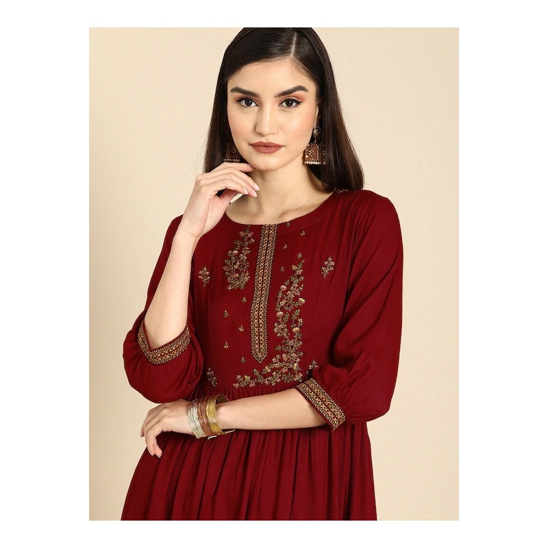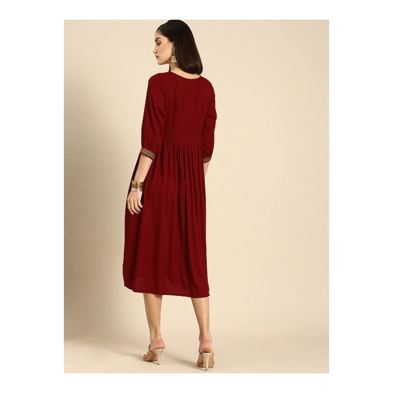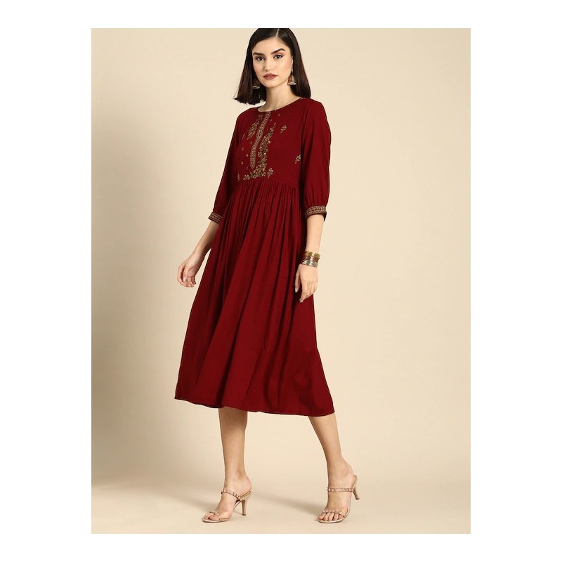 Индийское платье миди красного цвета с красивой вышивкой нитью. Платье имеет А-силуэт, округлый ворот, рукава три четверти.