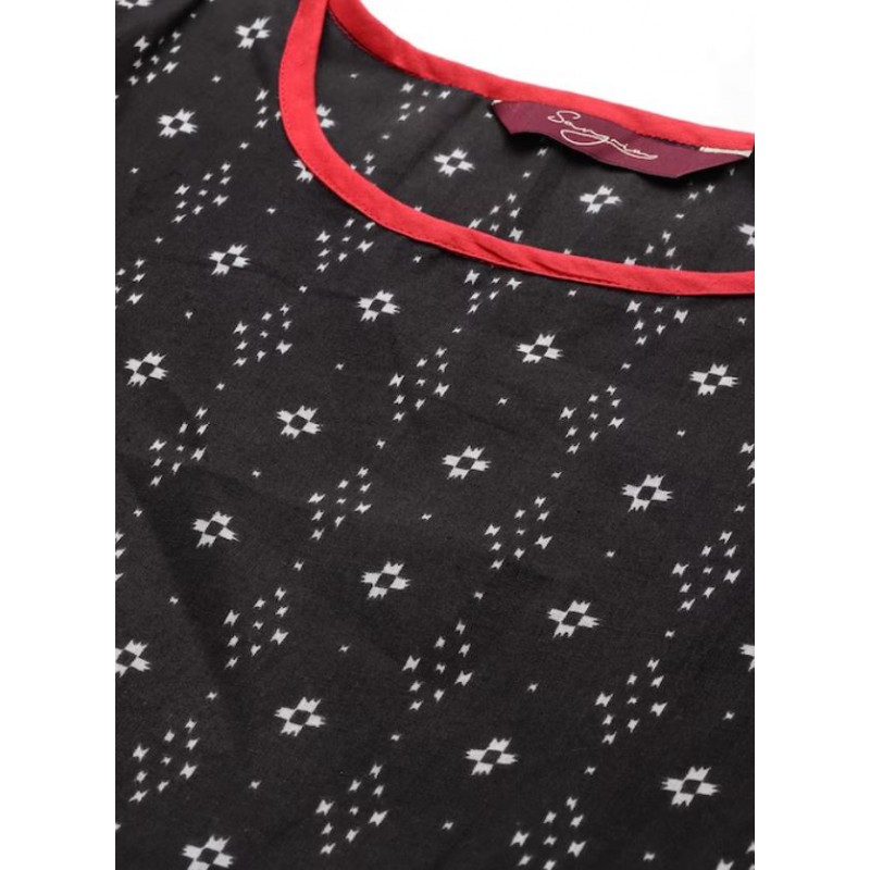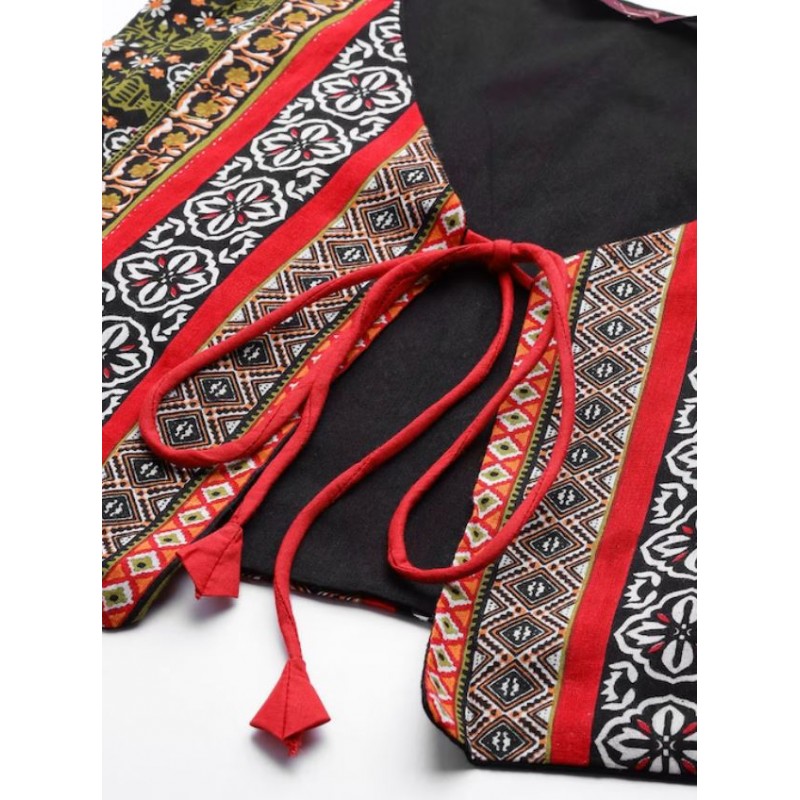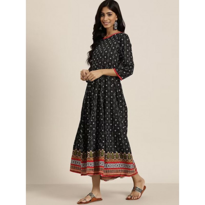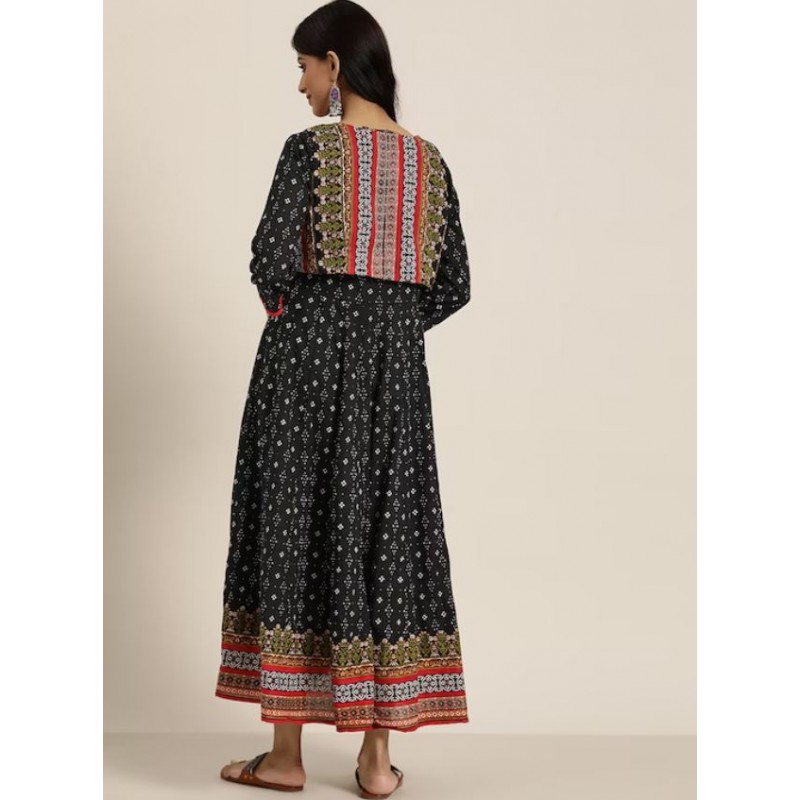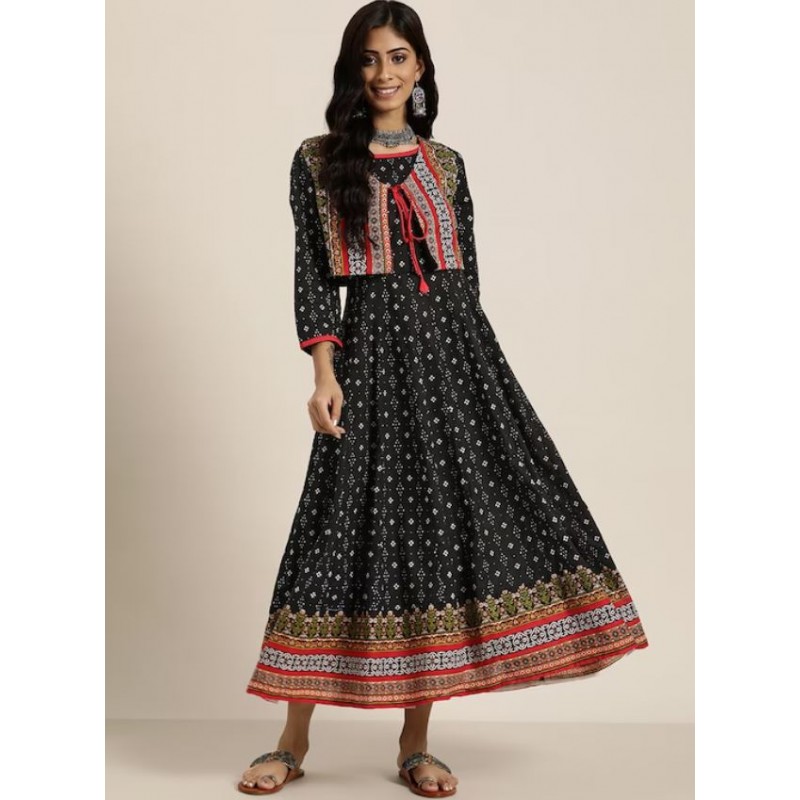 Длинное индийское платье анаркали черное с этно принтом. Платье имеет А-силуэт, округлый ворот, рукава три четверти. В комплекте короткая жилетка на завязках.