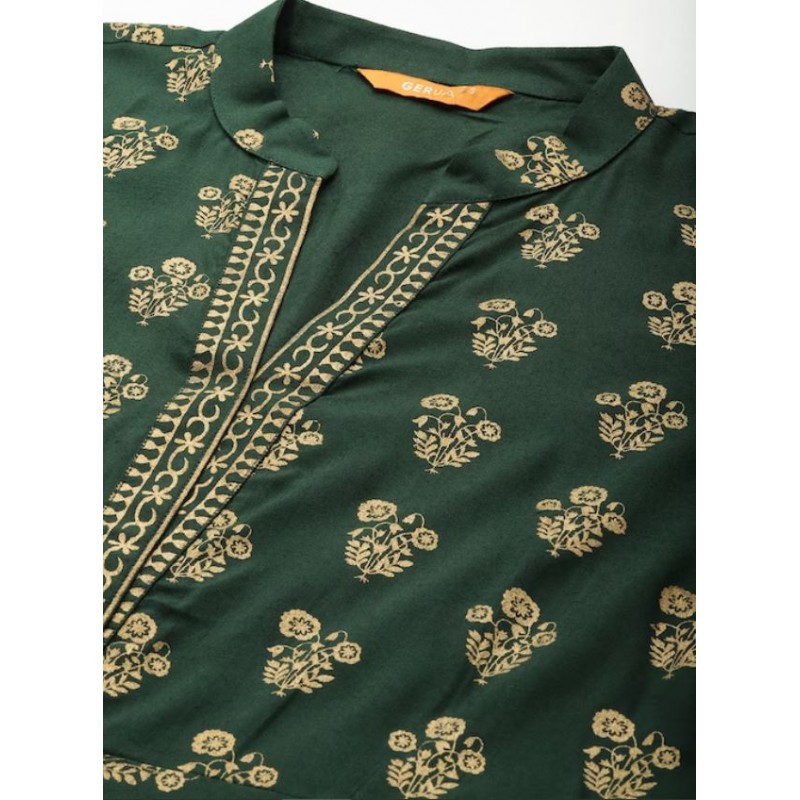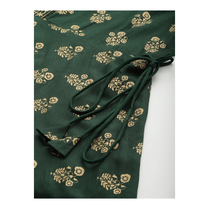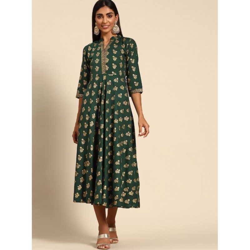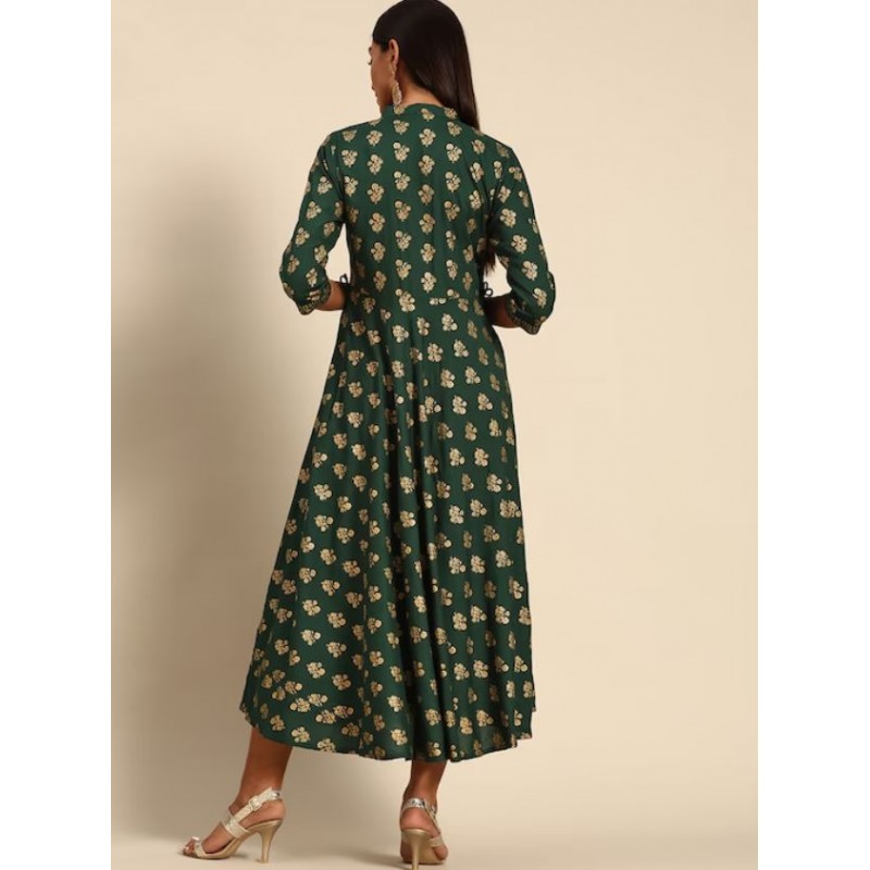 Индийское платье анаркали длинное темно зеленое с цветочным золотым принтом. Платье имеет А-силуэт, китайский воротничок, рукава три четверти, декоративные завязки по бокам.