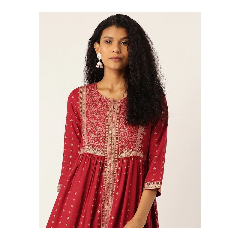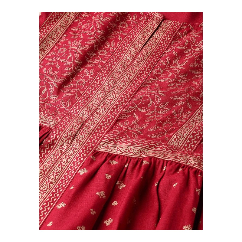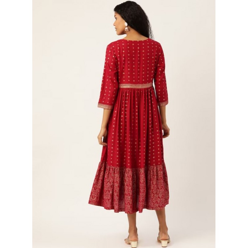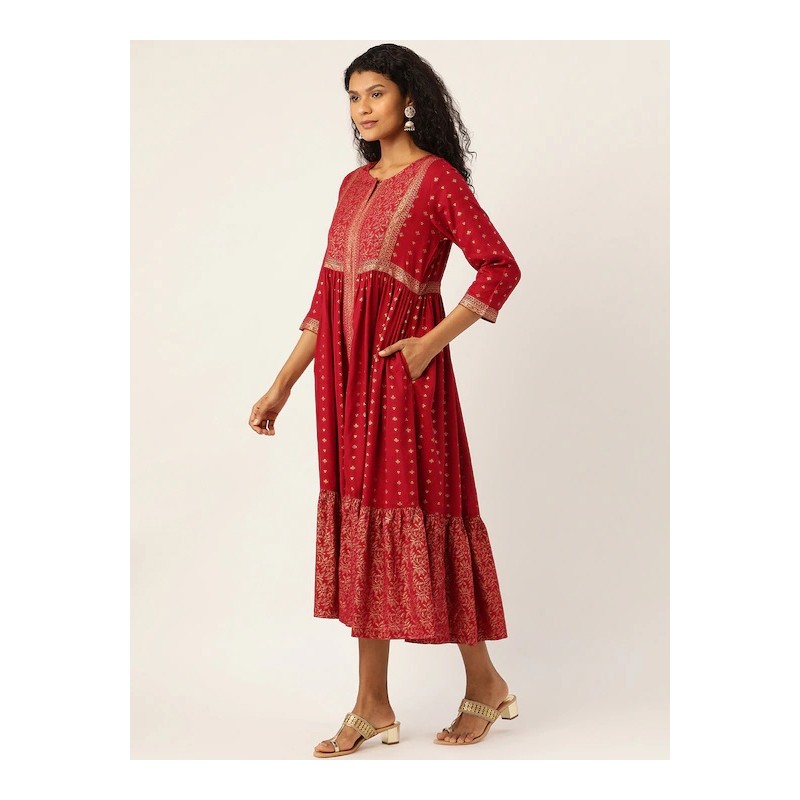 Индийское платье красного цвета с золотым набивным рисунком. Платье имеет А-силуэт, округлый ворот, рукава три четверти. Карманов , к сожалению, нет.