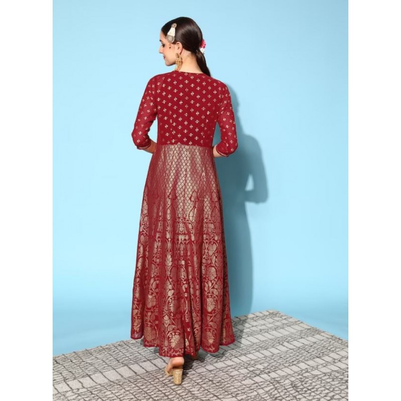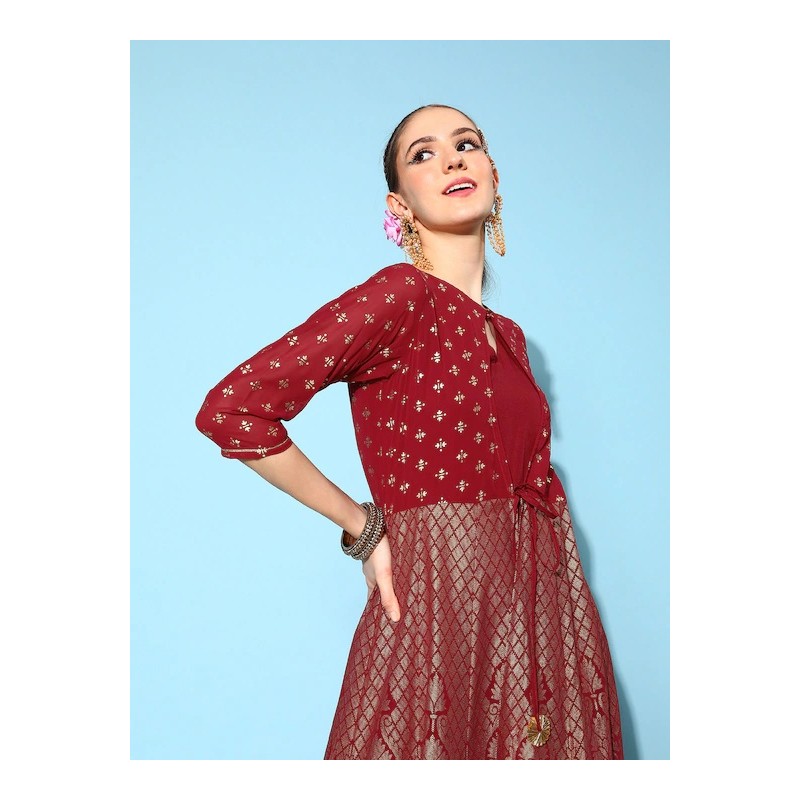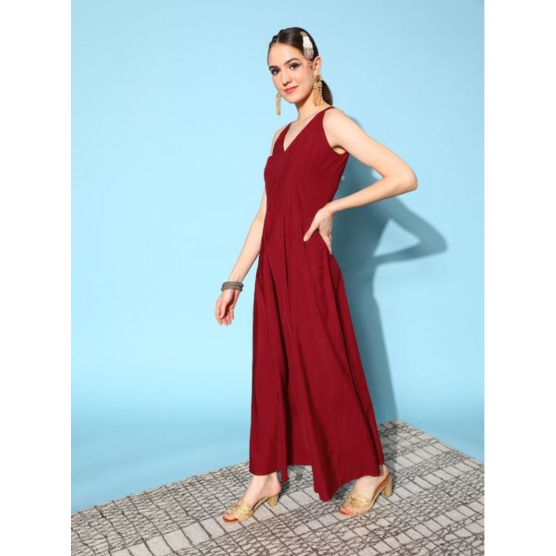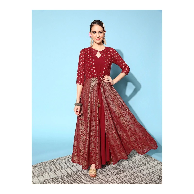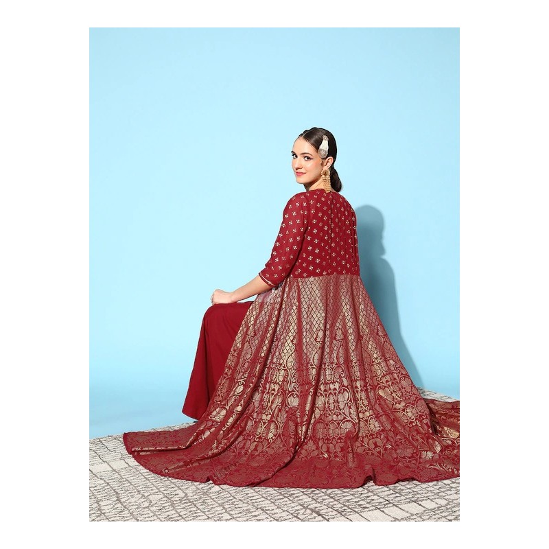 Индийское длинное платье бордового цвета без рукавов с V-образным вырезом и бордовая накидка с золотым принтом и завязками с красивыми декоративными элементами.