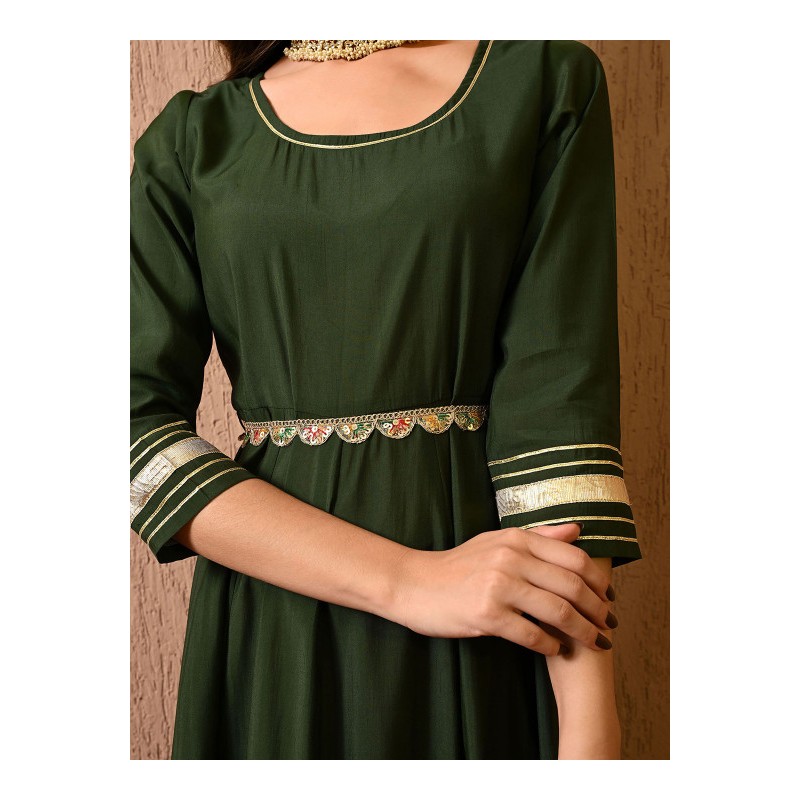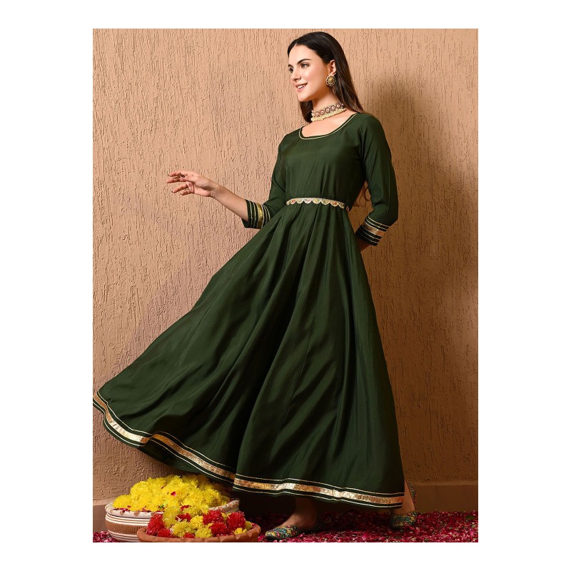 Индийское длинное платье зеленое хаки с отделкой золотистой каймой. Платье имеет А-силуэт, округлый ворот, рукава три четверти, декоративный пояс с завязками сзади.
