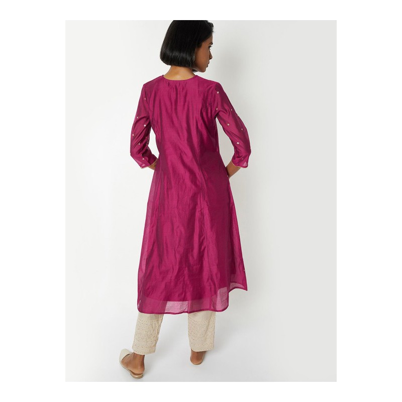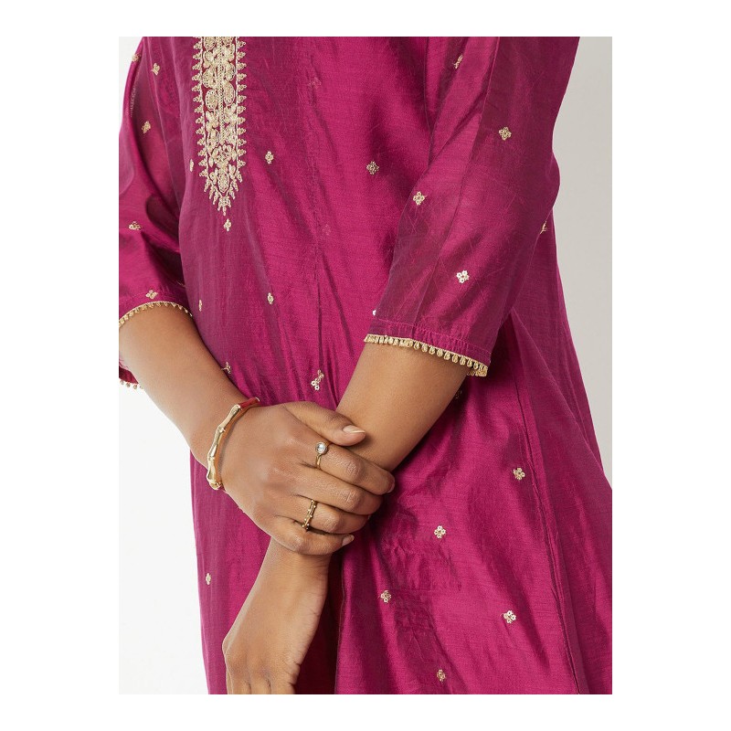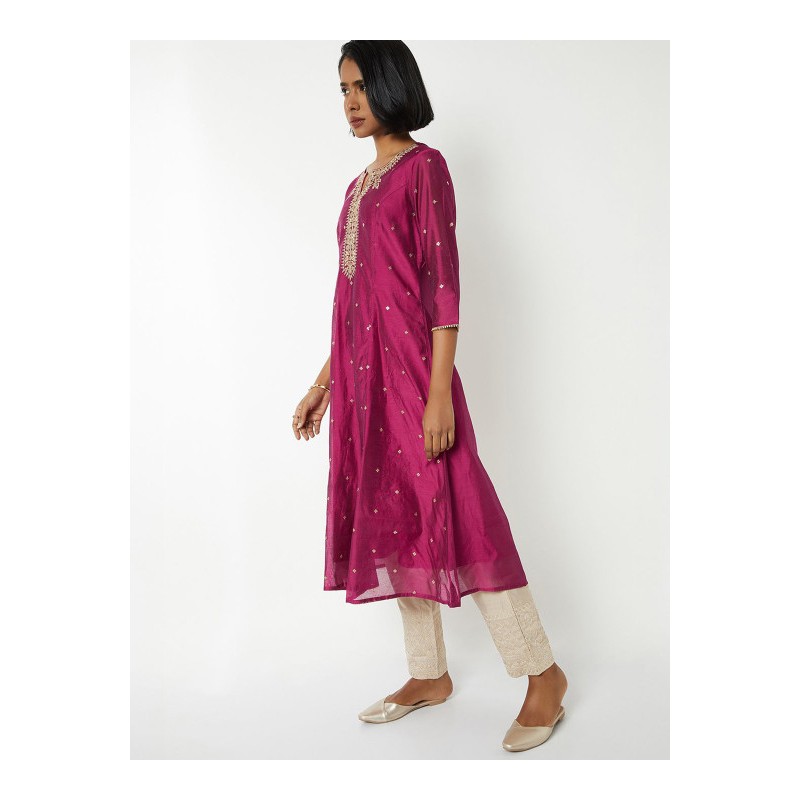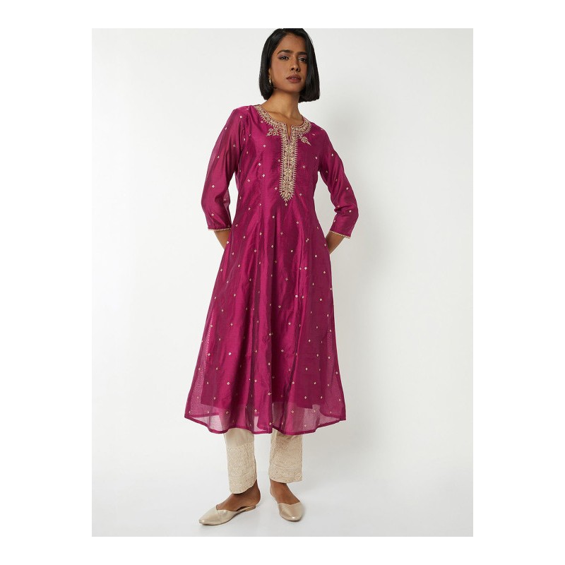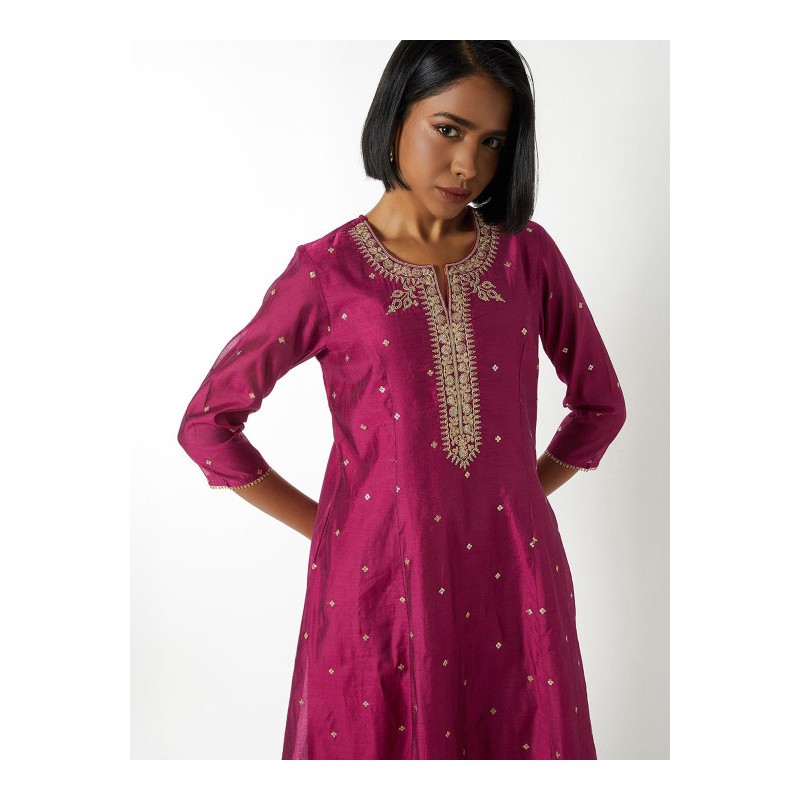 Индийская туника/ платье анаркали А-силуэта цвета фуксия с красивой вышивкой золотой нитью и пайетками. Туника имеет А-силуэт, округлый ворот, рукава три четверти.