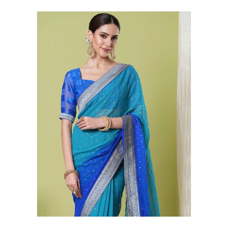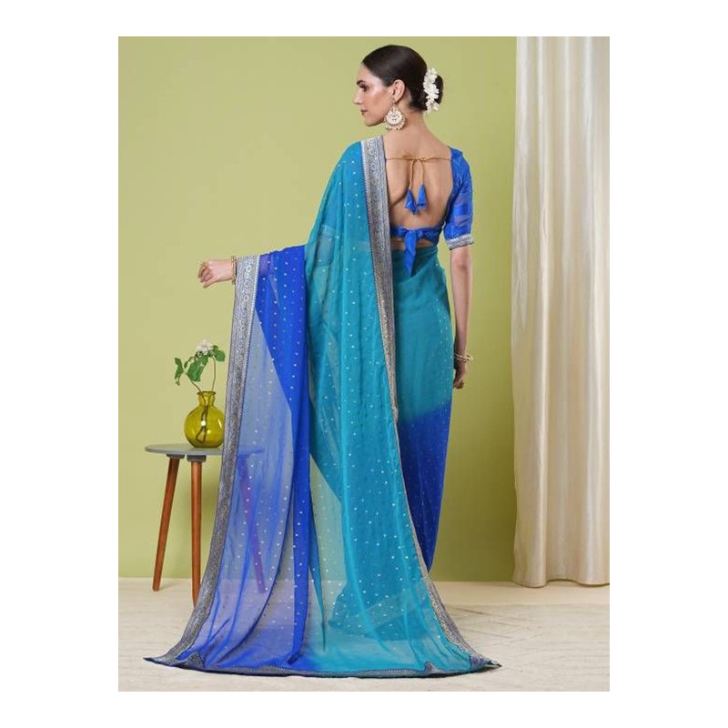 Индийское сари синее с градиентом цвета до голубого с расшитой золотом каймой и печатным золотым рисунком по полю сари.