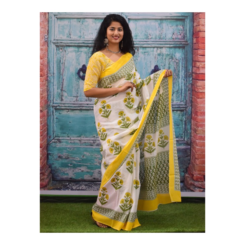 Индийское сари белое с желтыми цветами (принт)