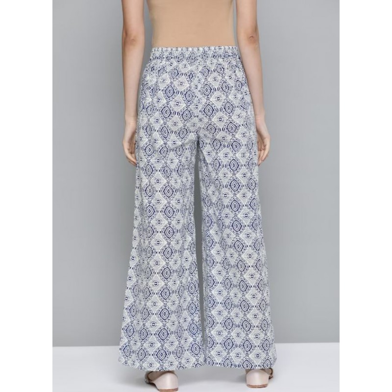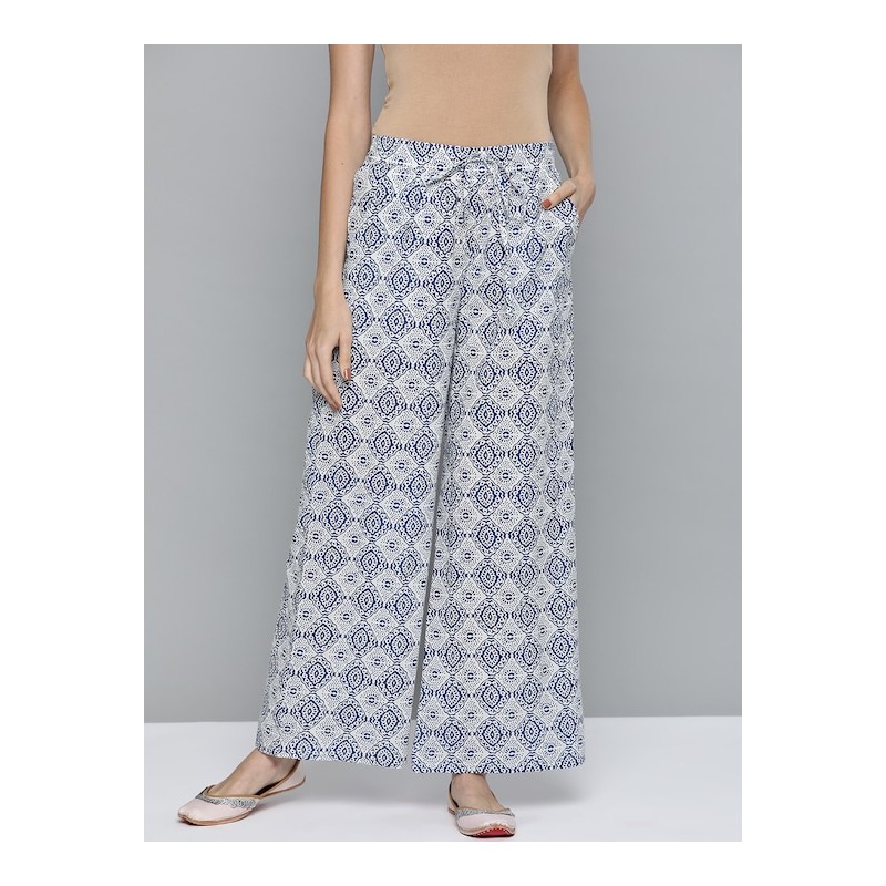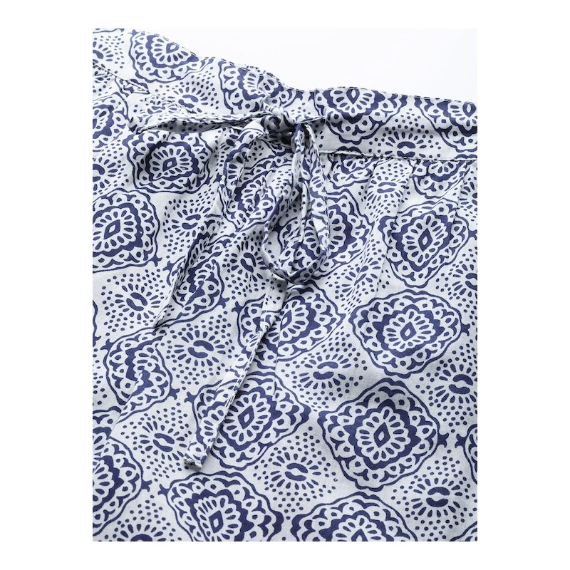 Индийские штаны белые с синим этно принтом. На поясе сзади эластичная резинка, спереди шнурок в кулиске для лучшей фиксации на талии. По бокам карманы.