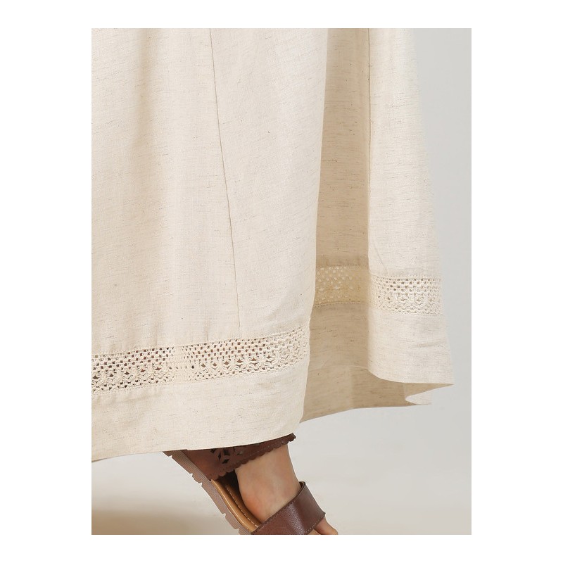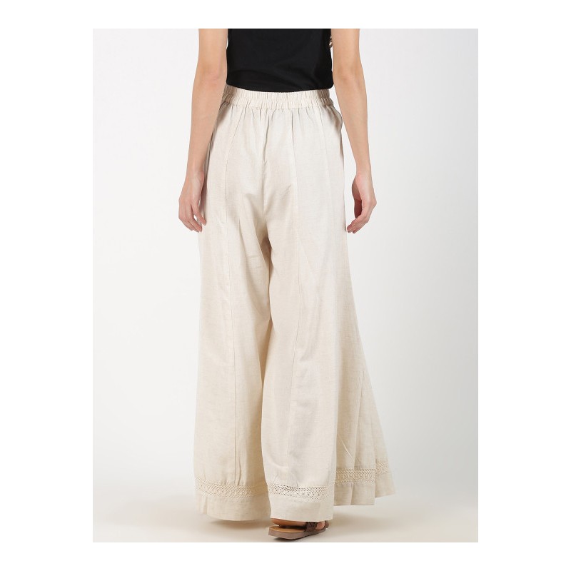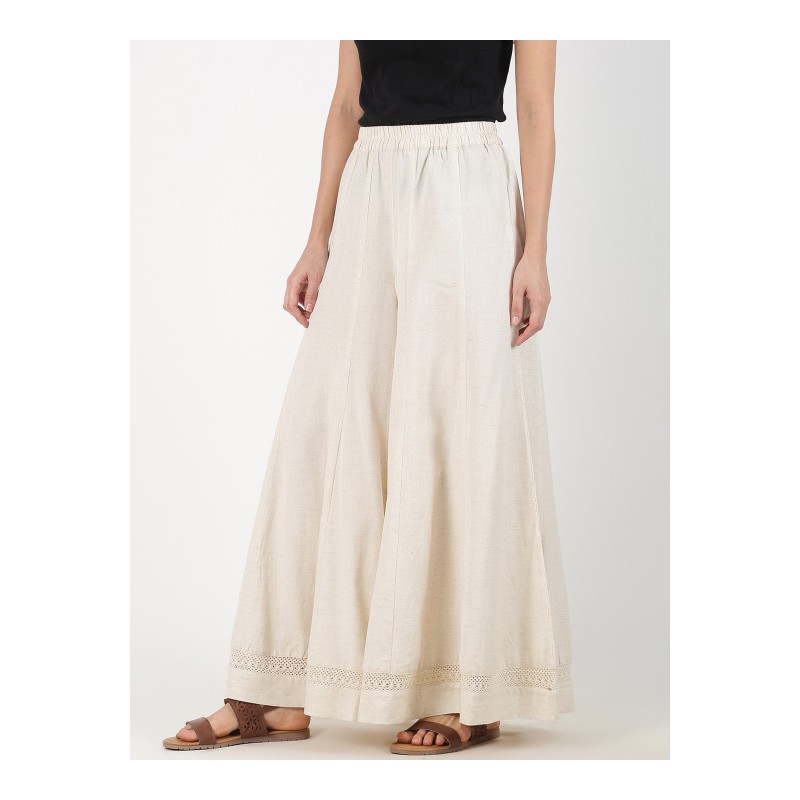 Индийские брюки палаццо очень широкие кремовые с кружевными вставками на штанинах внизу. На поясе резинка.
