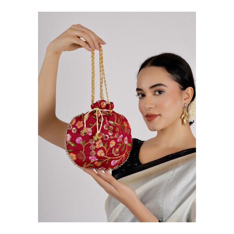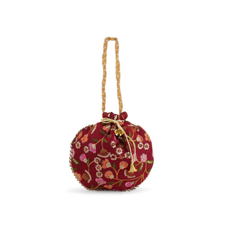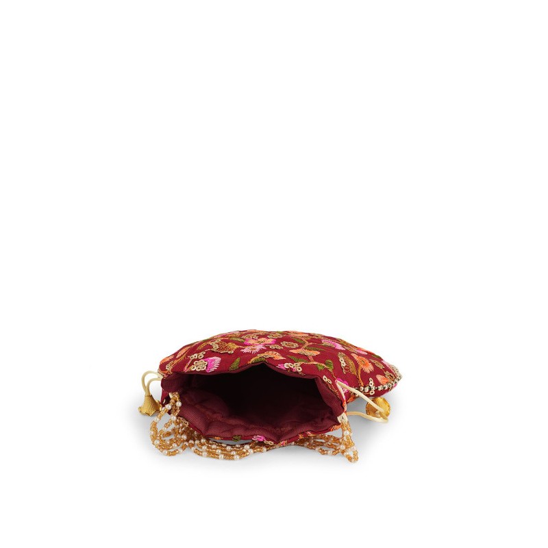 Индийская сумочка бордовая с вышивкой цветными нитями, пайетками с ручкой из искусственного жемчуга.