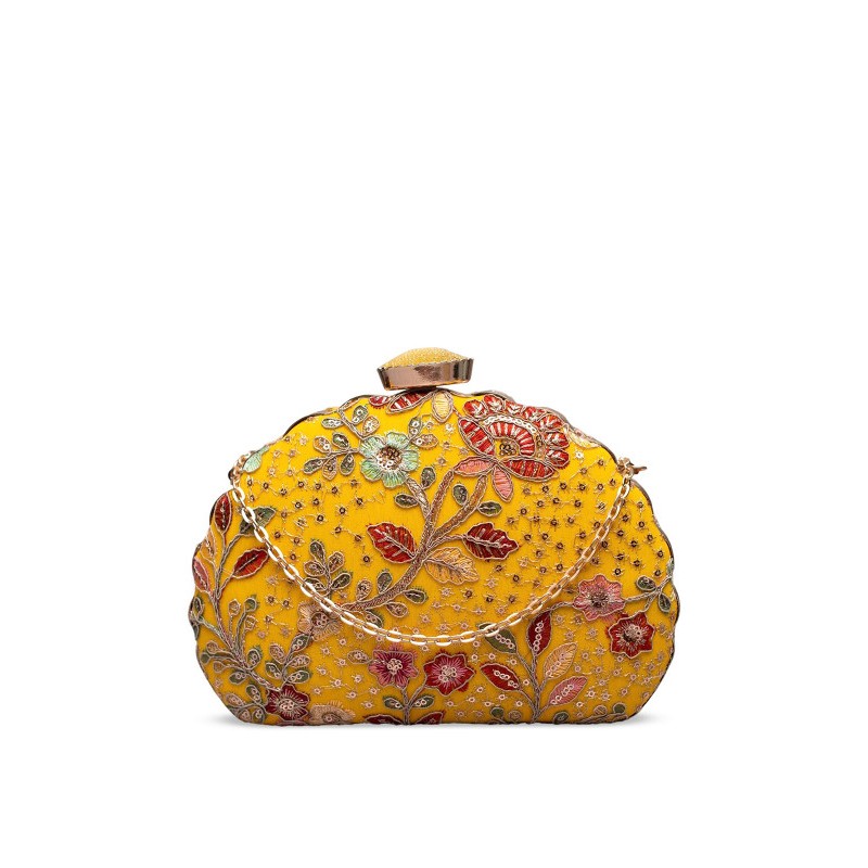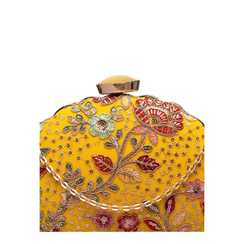 Индийская сумка клатч желтая с вышивкой золотой и цветными нитями, мелкими пайетками.