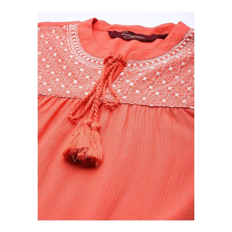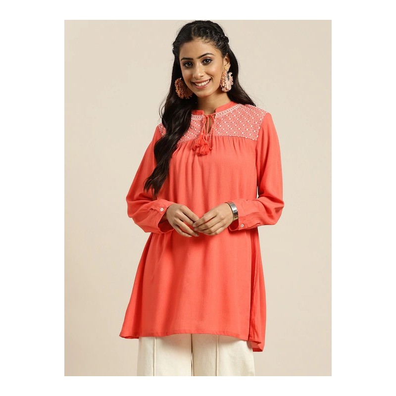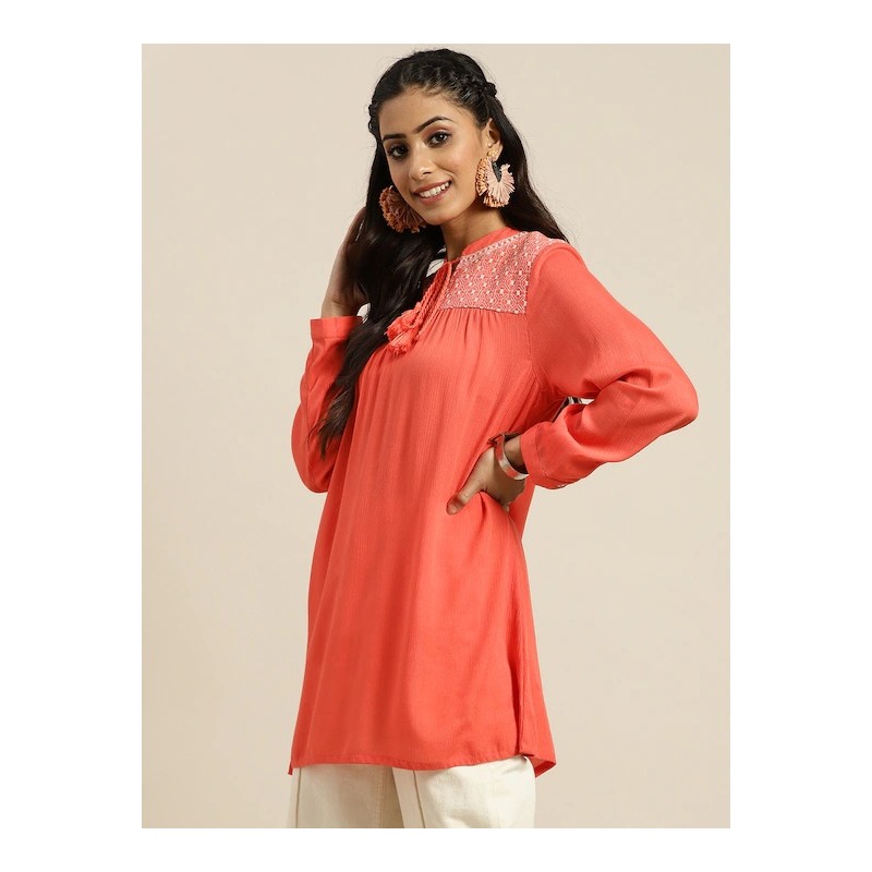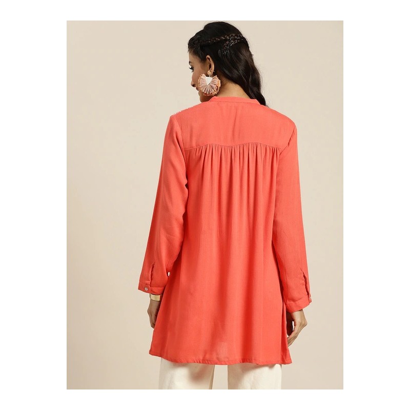 Индийская туника кораллового цвета с белой вышивкой. Туника имеет китайский воротничок с завязками, длинные рукава с пуговицами.