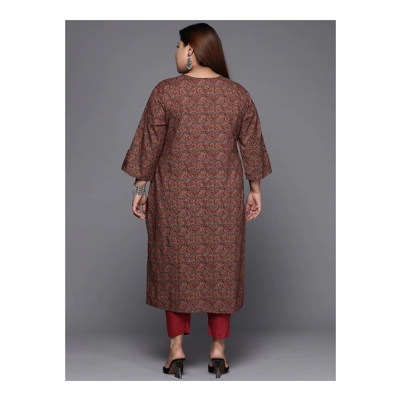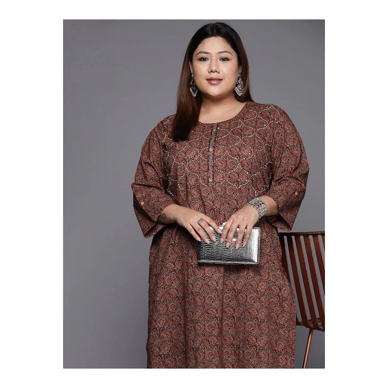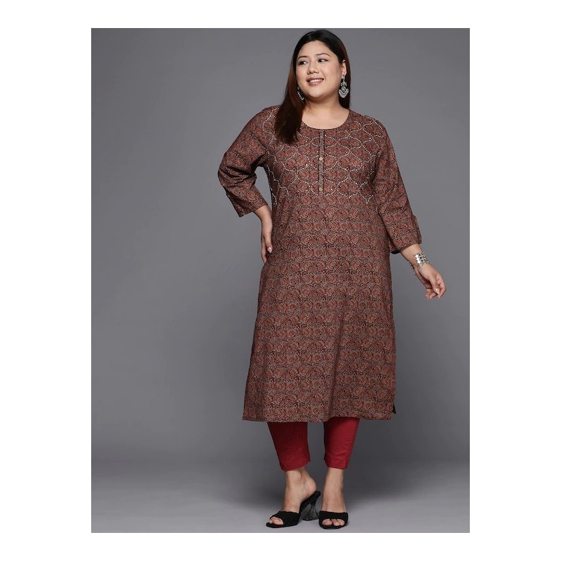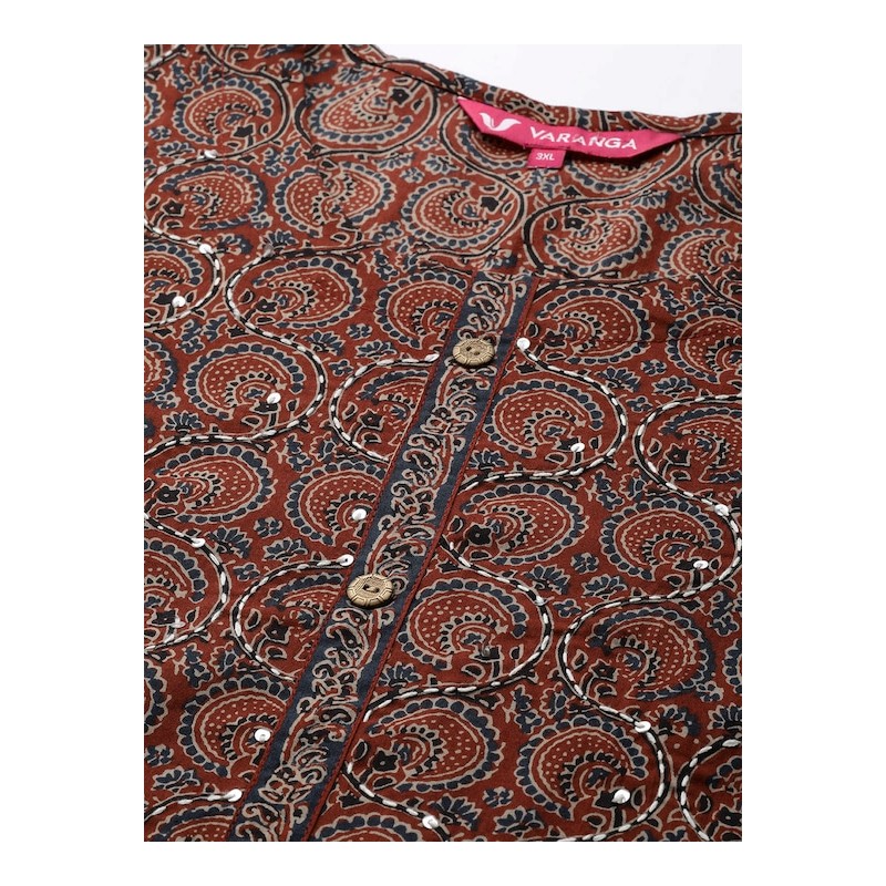 Индийская туника кирпичного цвета с синими цветами и вышивкой нитью и пайетками. Туника имеет прямой силуэт, рукава три четверти, округлый вырез, разрезы по бокам.