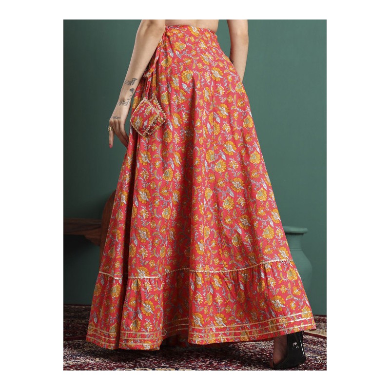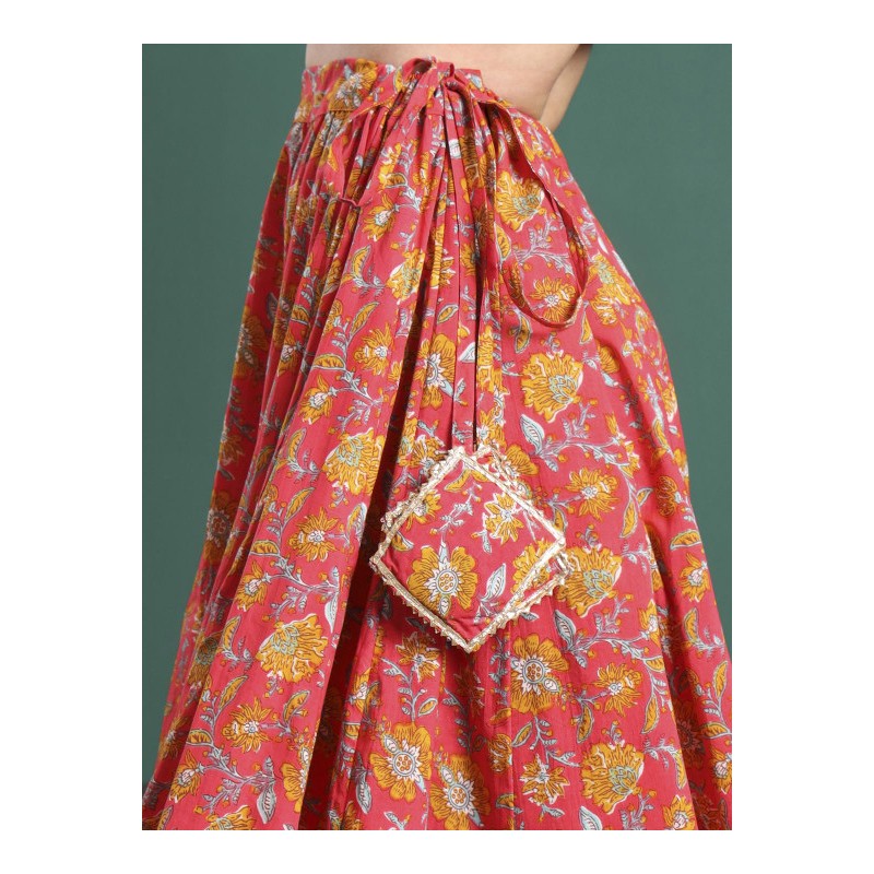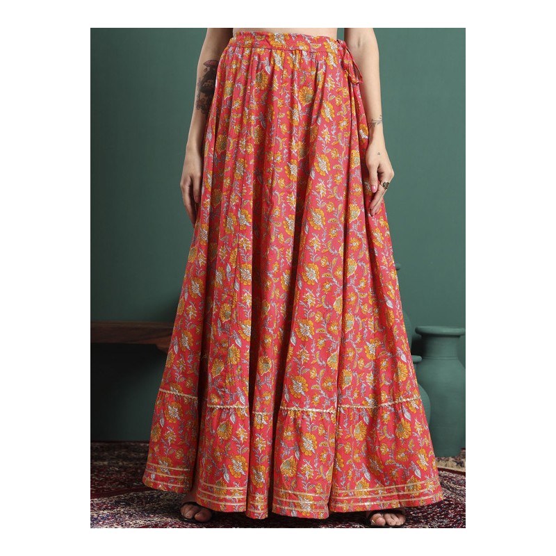 Длинная индийская юбка А-силуэта розового цвета с оранжевыми цветами и золотистой тесьмой, на поясе кулиска со шнурком.