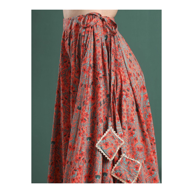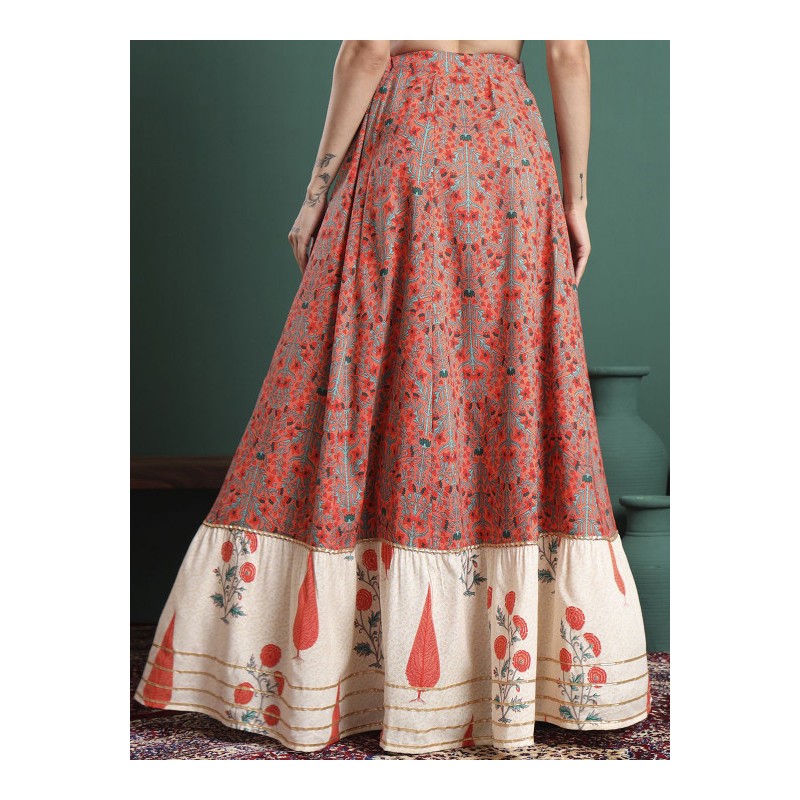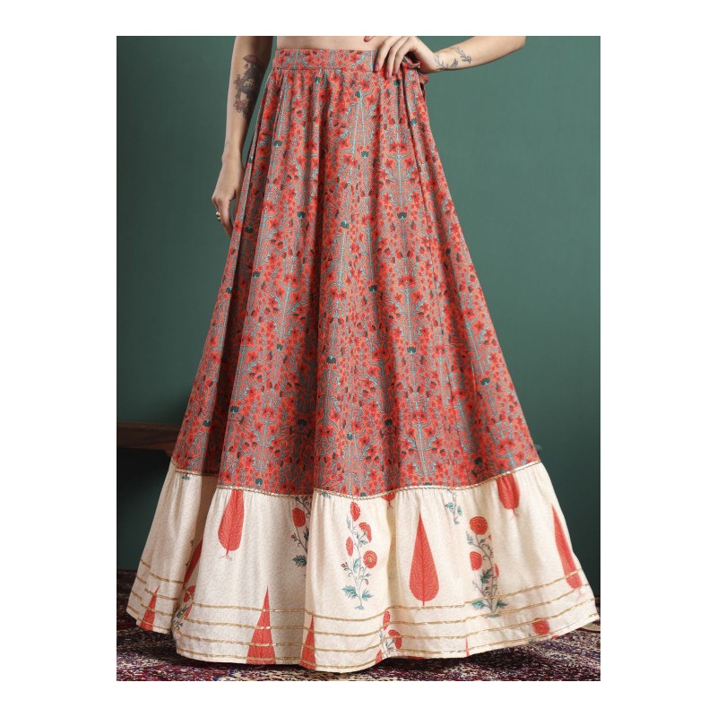 Длинная индийская юбка А-силуэта оранжевая с цветочным принтом, контрастным подолом с принтом "кипарисы", украшена вышивкой тесьмой готта патти. На поясе кулиска со шнурком. Длина юбки 100 см, талия 90 см (затягивается на меньший обхват)
